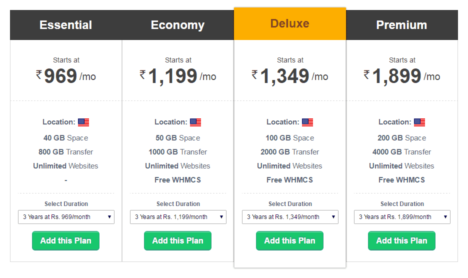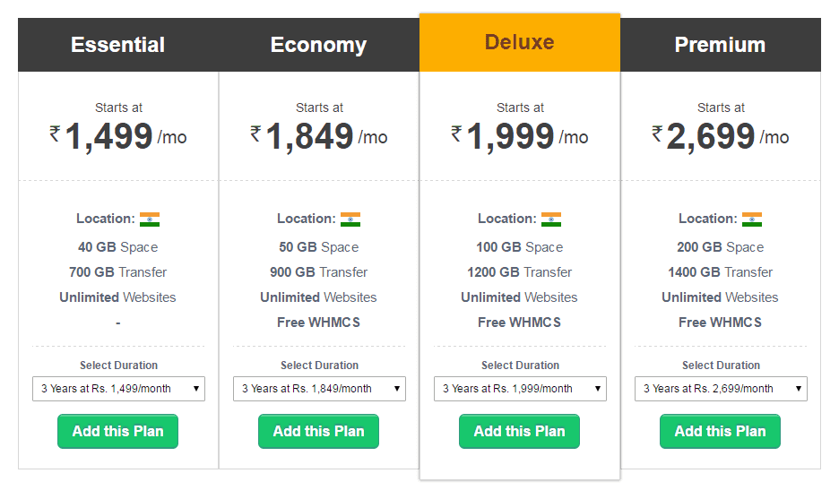 #3. Deluxe: Starts at INR. 1999/mo, comes with 100GB space, 1200GB transfer, Unlimited websites, Free WHMCS.
